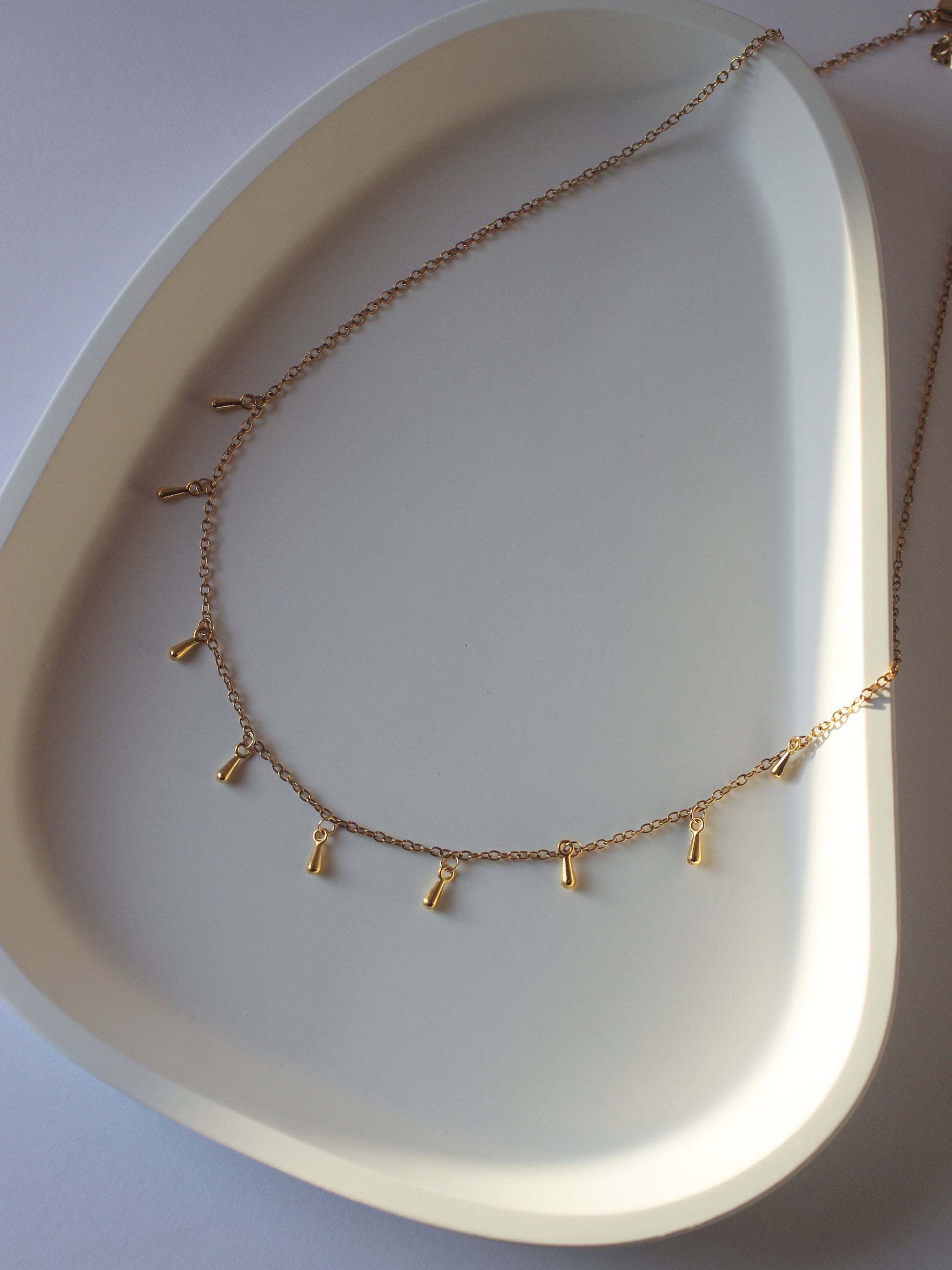 Diese feine Halskette aus hochwertigem Edelstahl ist 18k vergoldet und verleiht jedem Look eine elegante Note. Mehrere filigrane Tropfenanhänger sind harmonisch aneinandergereiht und sorgen für ein edles, feminines Design. Die glänzende Goldoberfläche unterstreicht die zarte Form der Anhänger und bringt das Schmuckstück dezent zum Strahlen.