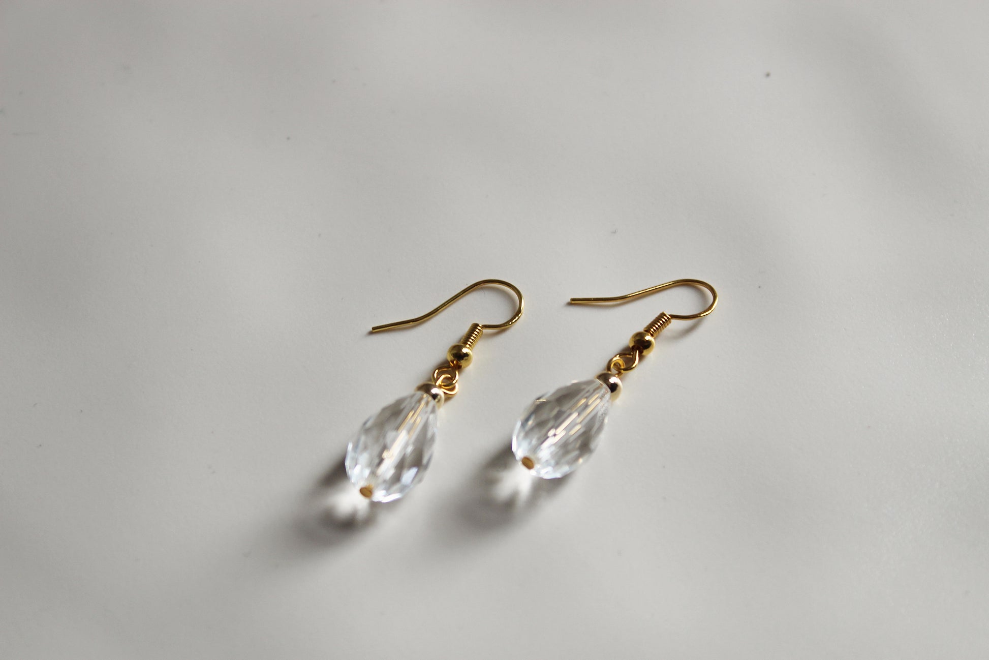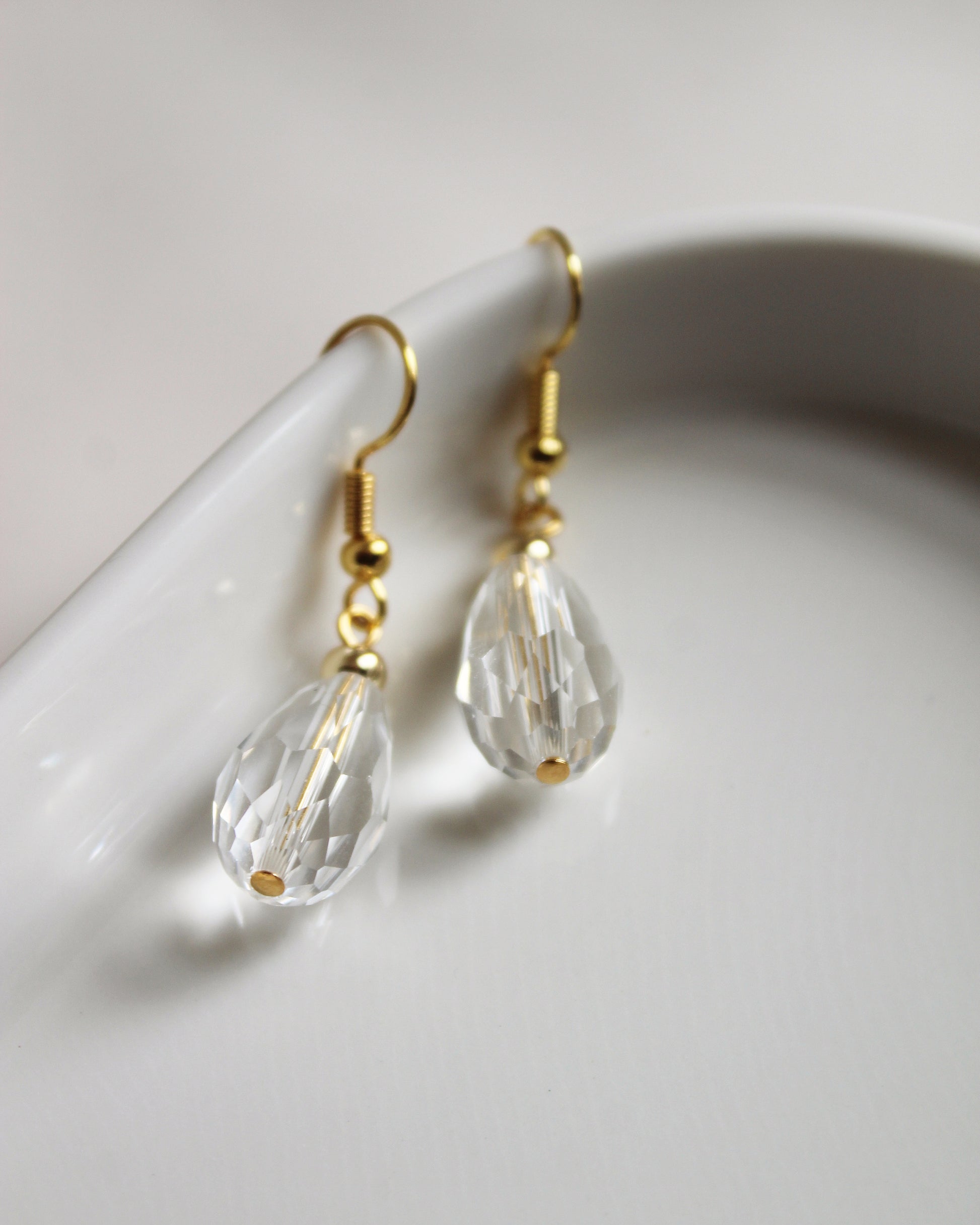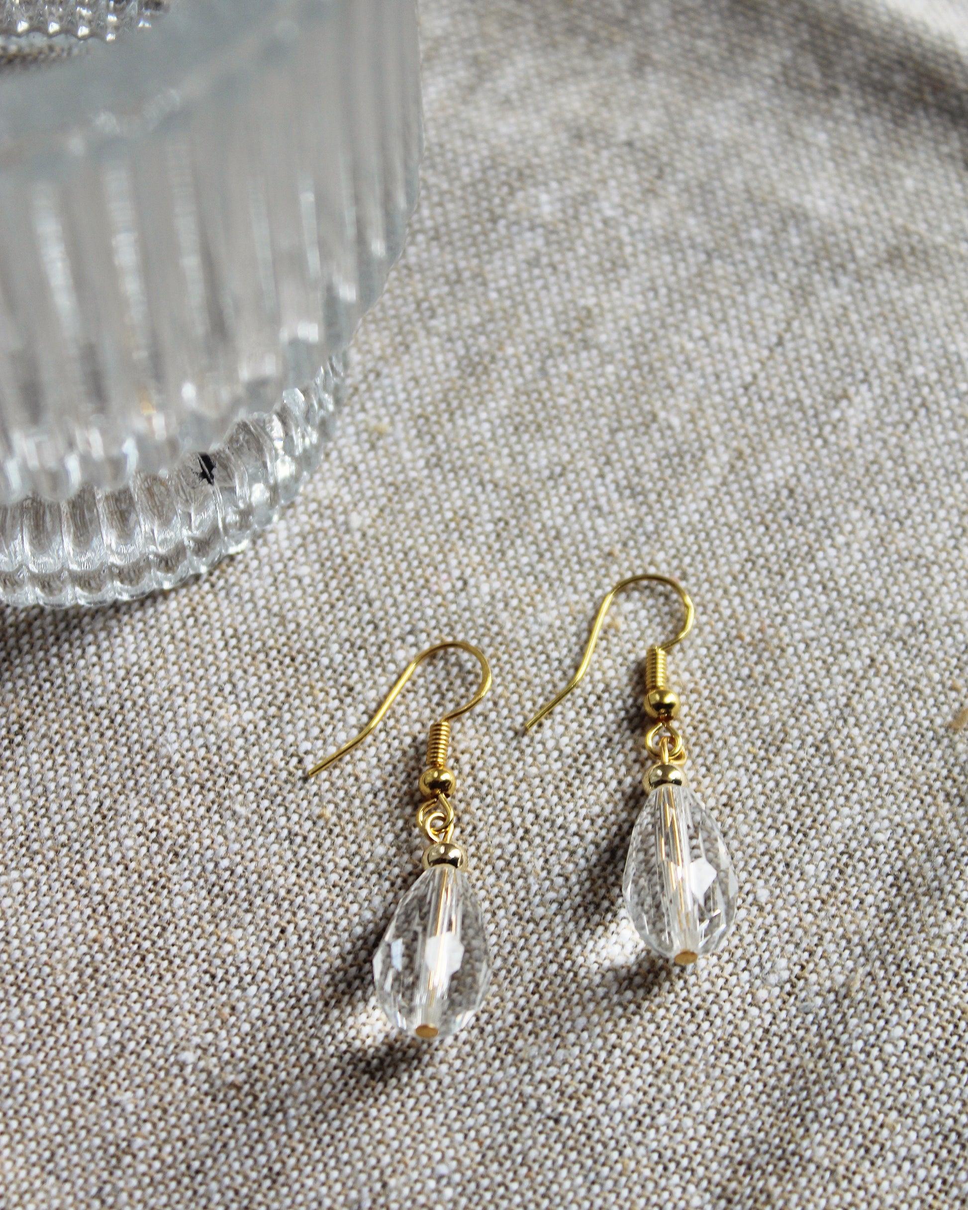 Als feines Detail hängt eine klare Tropfenperle am unteren Ende – dezent schimmernd und leicht transparent, was dem Design eine schlichte, edle Ausstrahlung verleiht.