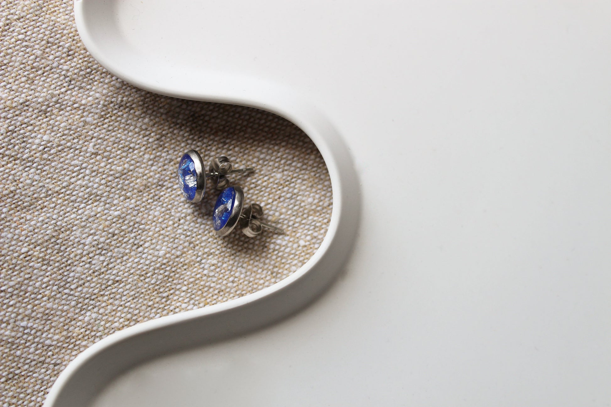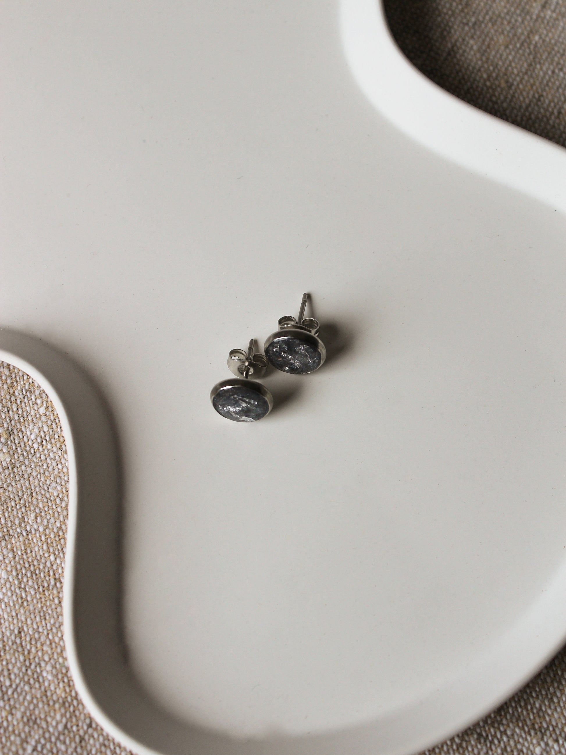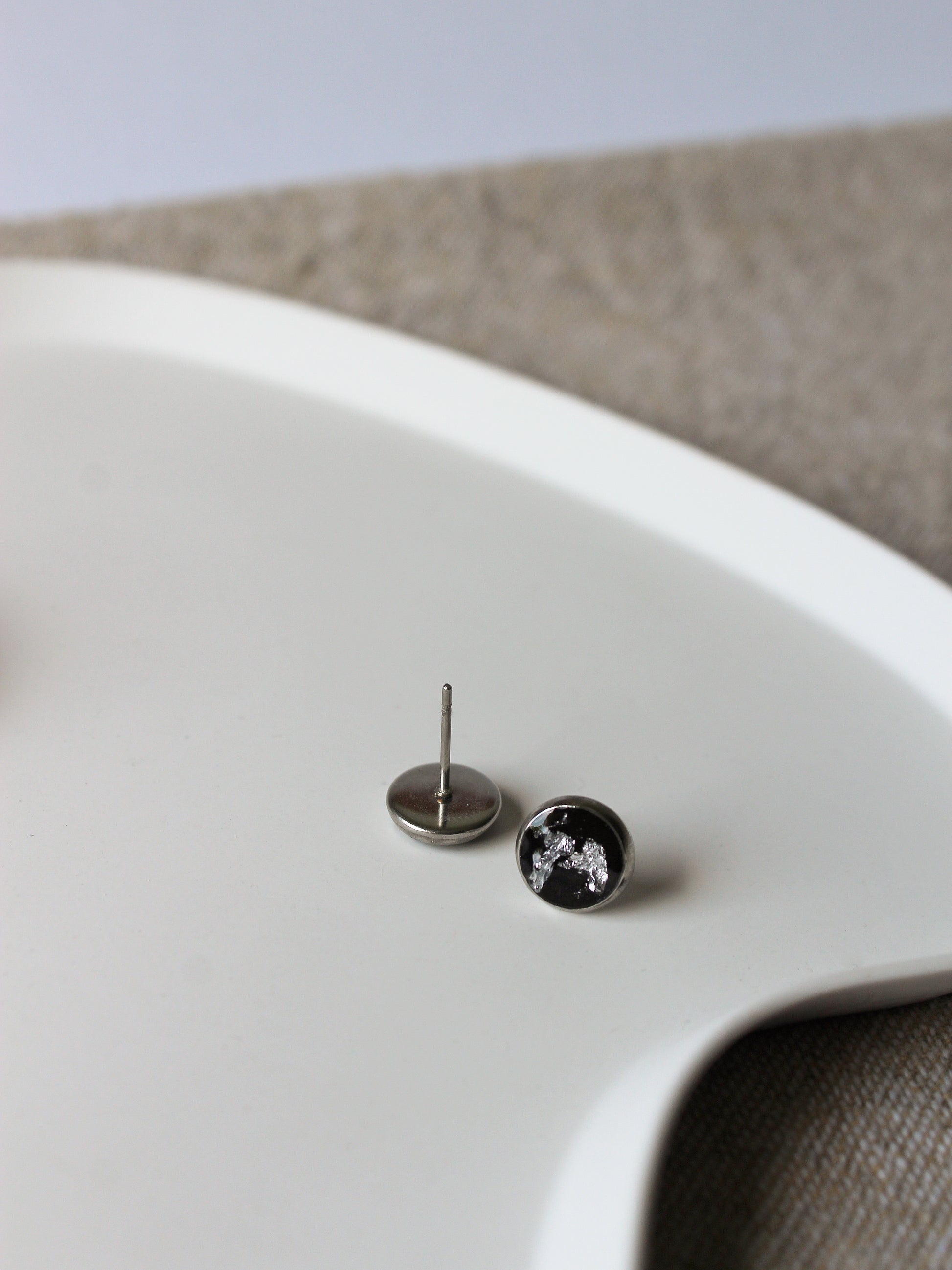 Diese Ohrstecker bestehen aus UV-Harz, das von Hand gegossen und mit echtem Blattsilber veredelt wurde. Die schimmernden Einschlüsse im Harz sorgen für einen dezenten, aber besonderen Look.
