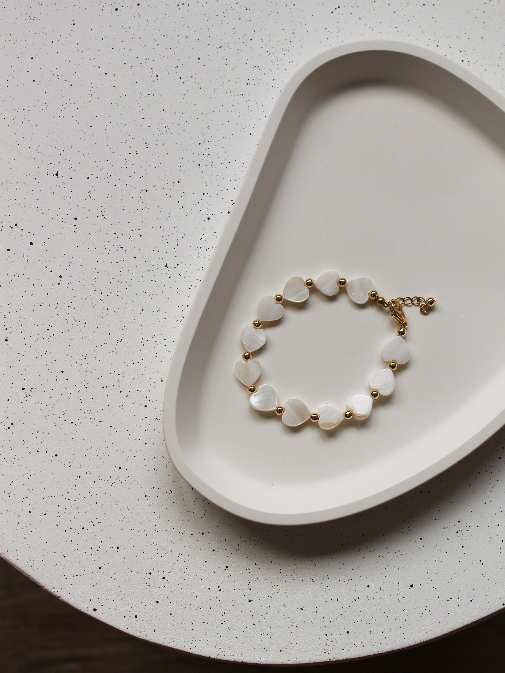 Dieses Armband vereint klassische Elemente mit einem modernen Touch. Die Herzperlen in zarter Perlmutt-Optik verleihen dem Schmuckstück eine sanfte, feminine Ausstrahlung. Vergoldete Edelstahlperlen setzen glänzende Akzente und bringen das Design zum Strahlen.