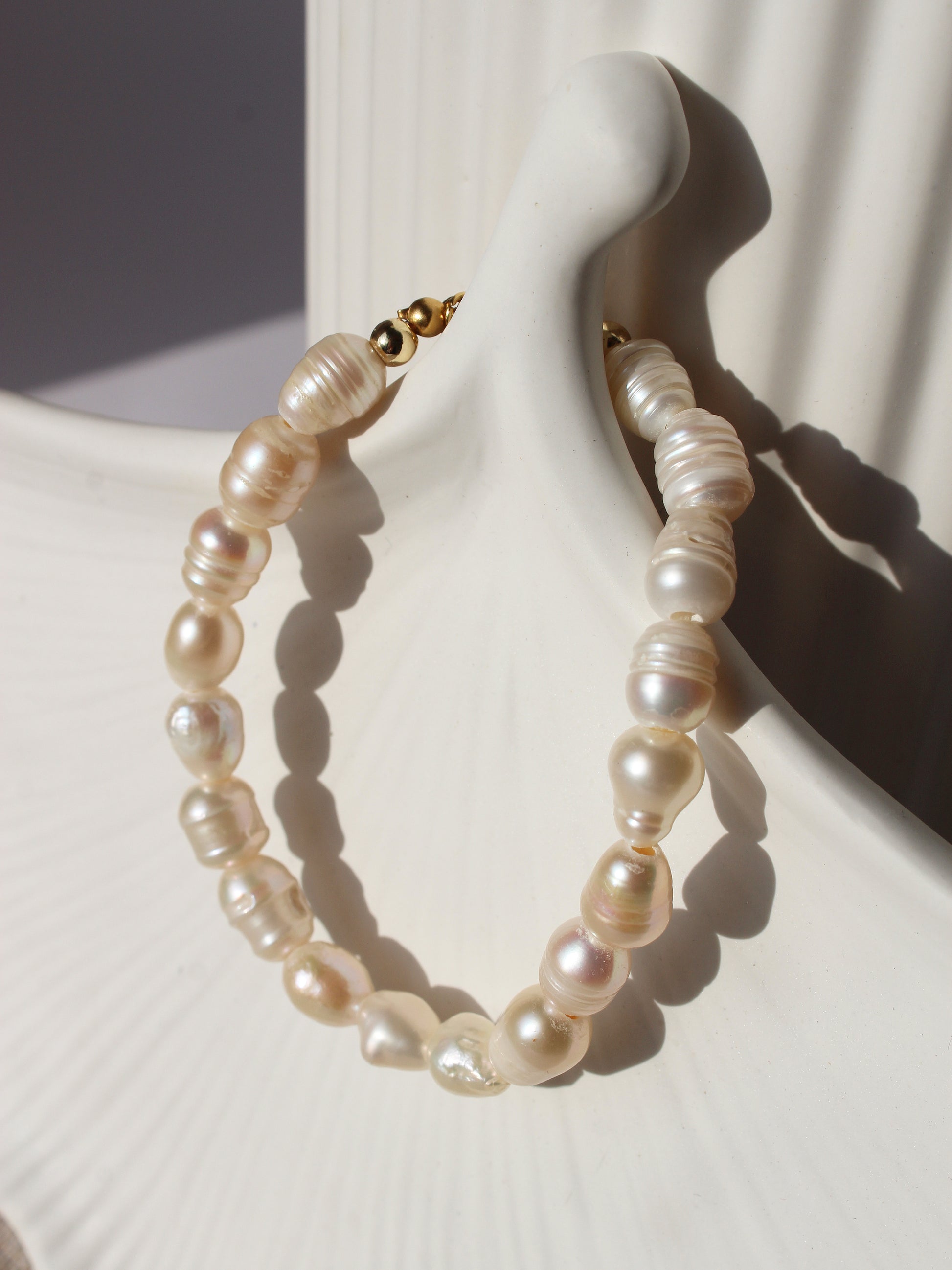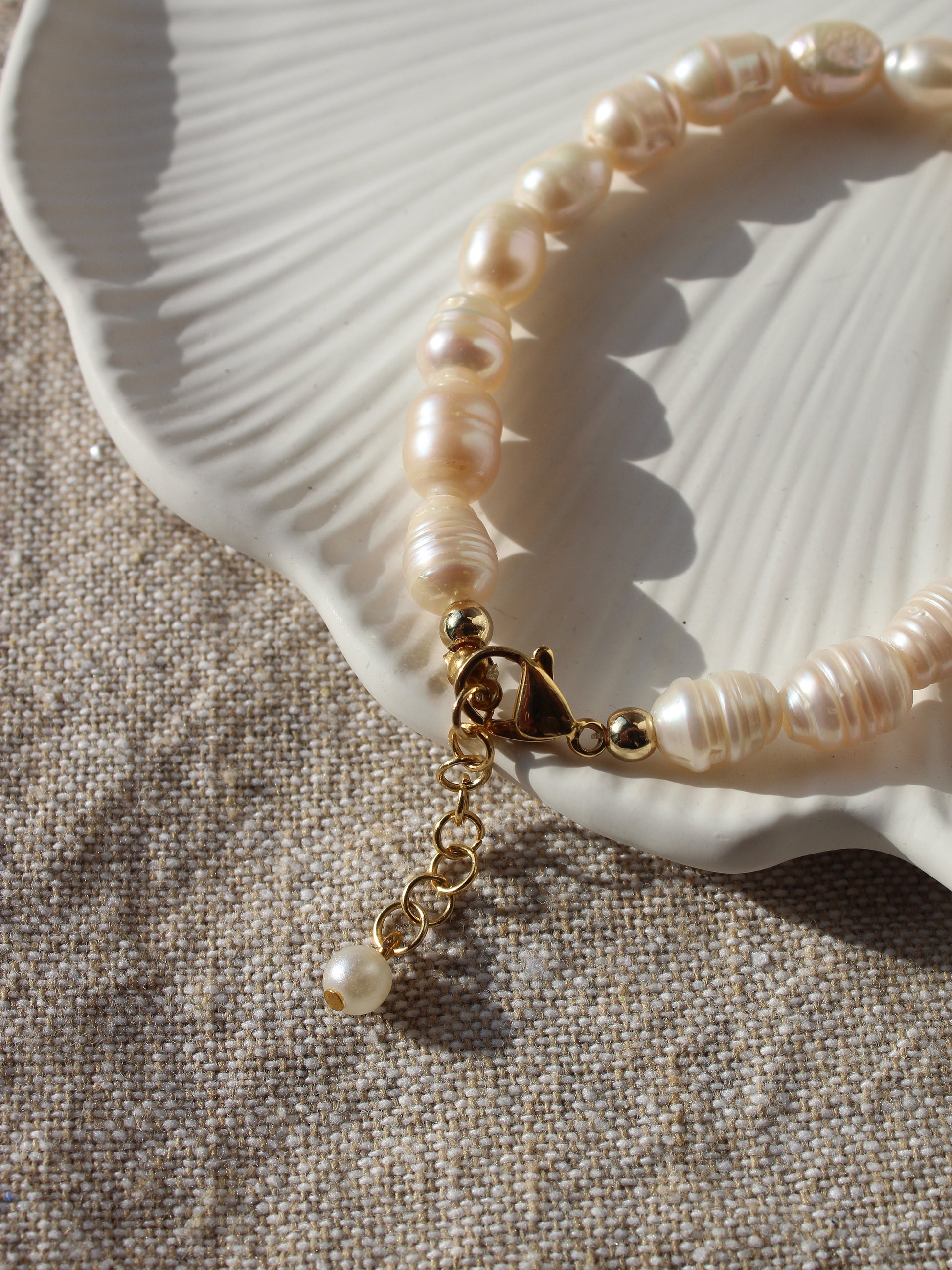 Dieses Armband vereint natürliche Schönheit mit klassischer Eleganz. Echte Süßwasserperlen mit ihrem sanften, natürlichen Schimmer machen jedes Stück zu einem Unikat. Ihre organische Form und zarte Farbnuancen verleihen dem Schmuck eine besonders edle Ausstrahlung.